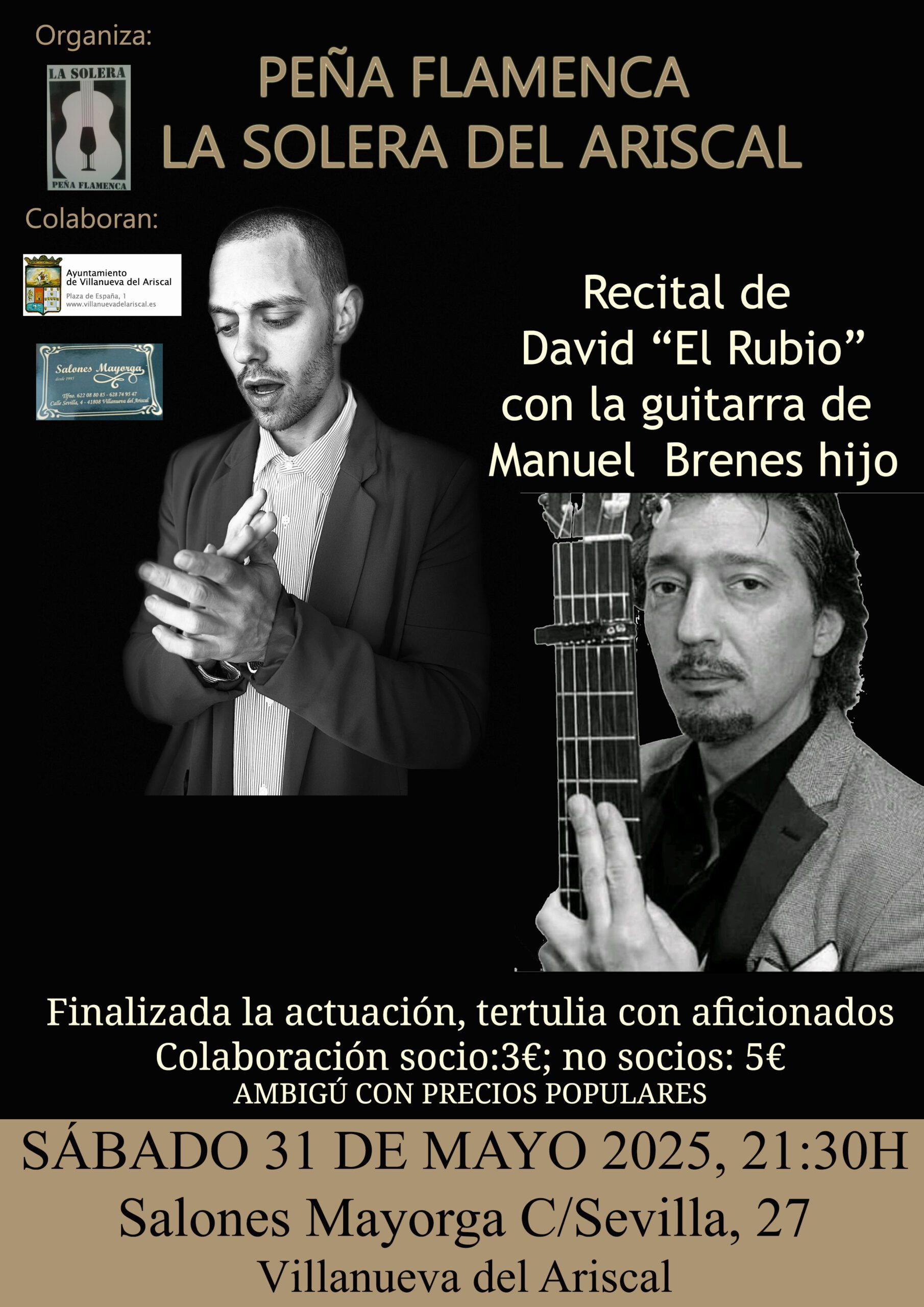 Recital de cante y guitarra, seguido de tertulia flamenca con aficionados. David el Rubio al cante y Manuel Brenes hijo a la guitarra.